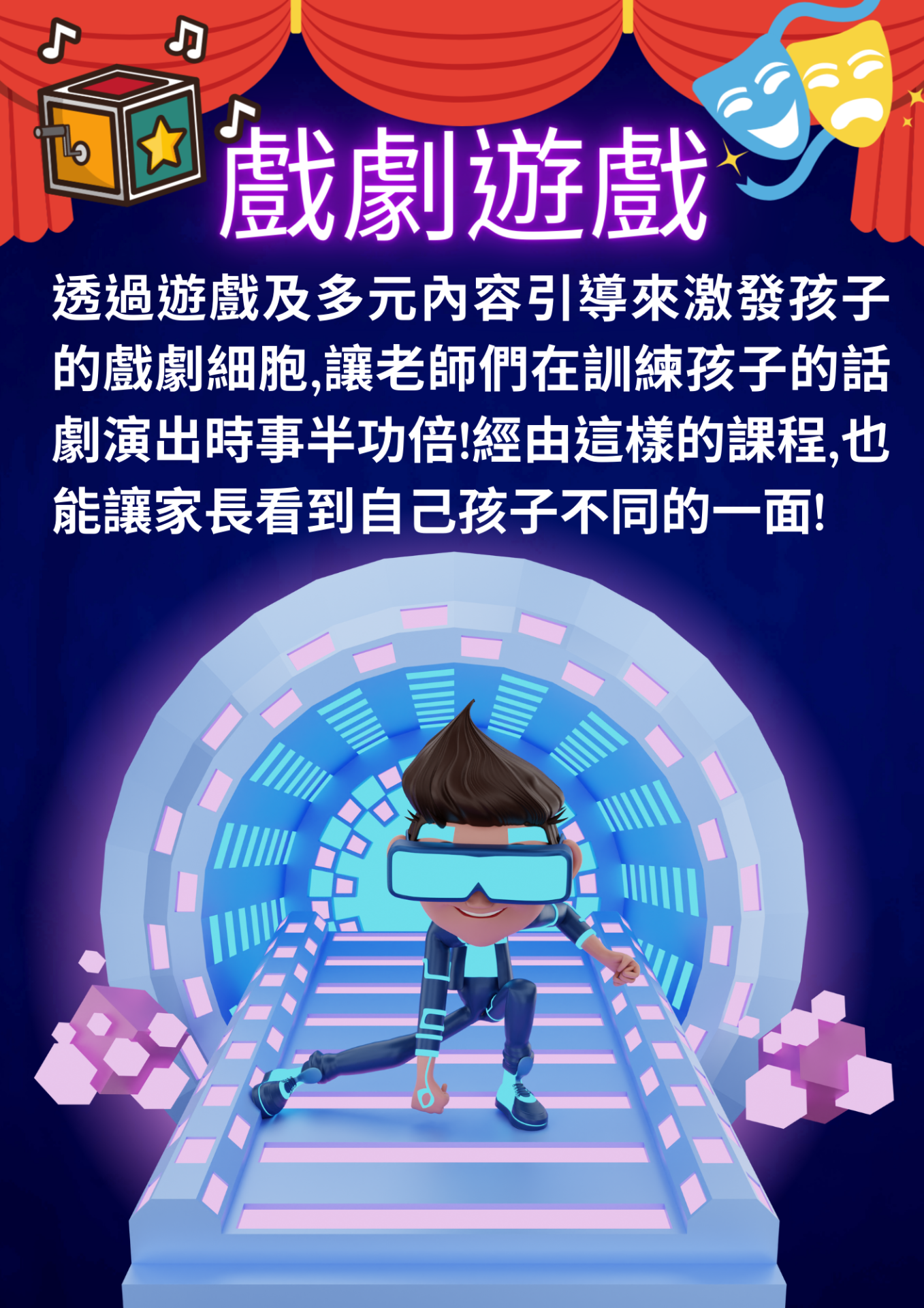 課程豐富多元層面呈現, EX: 故事融境、角色扮演、唱跳律動...等,除了遊戲引領孩子表演戲劇的能力,每個月的最後一堂課還可以將戲劇小道具帶回家與家人互動呦~