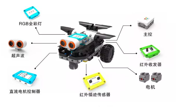 酷比克3.0套裝的硬件主要包括主控模塊,樂高兼容的電子積木和積木顆粒主控相當於人的大腦,負責分析和處理信息,進行協調溝通;主控內置大容量可充電鋰電池為整個系統提供能量;樂高兼容的電子積木如同感官和四肢,負責檢測和收集信號,以及執行控制命令;積木顆粒如同骨骼,負責整體結構的框架和支撐作用。