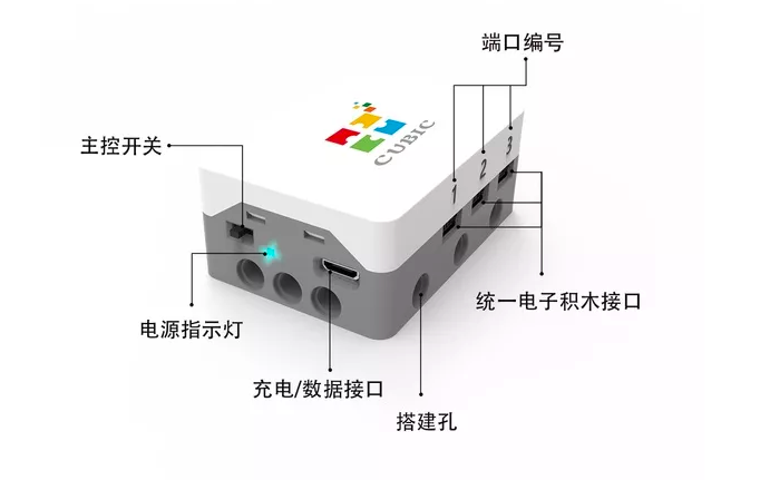 酷比克3.0套裝的硬件主要包括主控模塊,樂高兼容的電子積木和積木顆粒主控相當於人的大腦,負責分析和處理信息,進行協調溝通;主控內置大容量可充電鋰電池為整個系統提供能量;樂高兼容的電子積木如同感官和四肢,負責檢測和收集信號,以及執行控制命令;積木顆粒如同骨骼,負責整體結構的框架和支撐作用。
