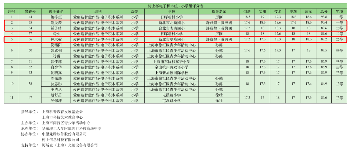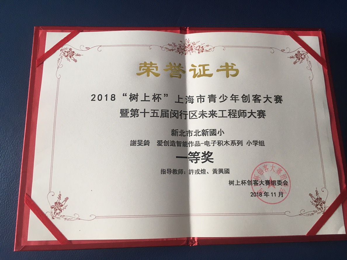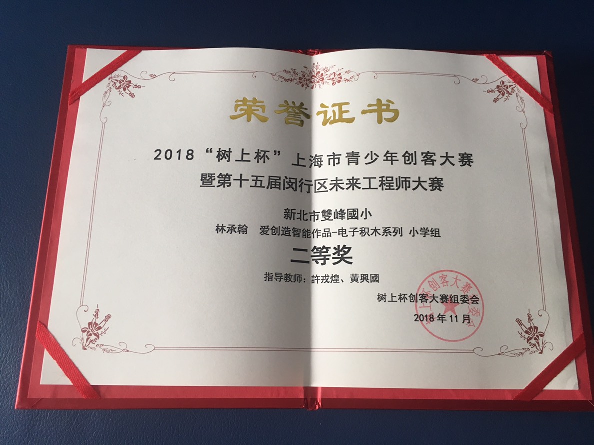 上海樹上杯未來工程師創客大賽於 2018/10/28 圓滿落幕 , 本次競賽台灣隊受邀一起參與與來自上海及大陸地區的小朋友交流互動 , 參與隊伍為數眾多台灣代表隊表現優現 , 在這一次的競賽中台灣隊有3組小選手參加愛創造智能作品-電子積木組的比賽 , 成績優異分別為一等獎新北市北新國小謝旻錡 , 二等獎台北市志清國小鍾予晴 , 二等獎新北市雙峰國小林承翰 , 恭喜三位小朋友努力爭取最高榮譽 ,也期望繼續秉持創客精神發揮創意想像力 , 以下為各位報導整個參賽過程 , 將榮耀分享給每一位朋友 .